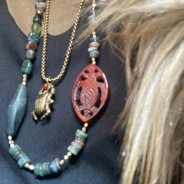 L’Atelier est aussi l’espace d’exposition de mes créations, bijoux ou amulettes qui prennent place sur les étagères, prêts à être adoptés.