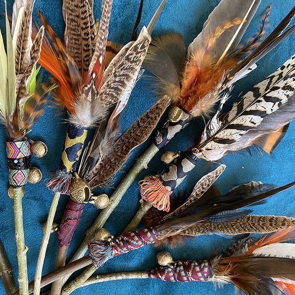 Portée par l’univers chamanique, l’Apprentie décline dans son atelier des accessoires rituels entièrement faits main : hochets, plumes de fumigation, koppeta, bâtons de parole, dessins et gravures uniques…