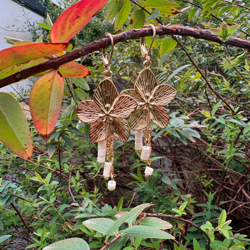 Boucle pour célébrer le printemps ! Fleurs de cerisier et chaînette en acier inoxydable. Perles blanc cassé en bois. Attache dormeuse en acier inoxydable.