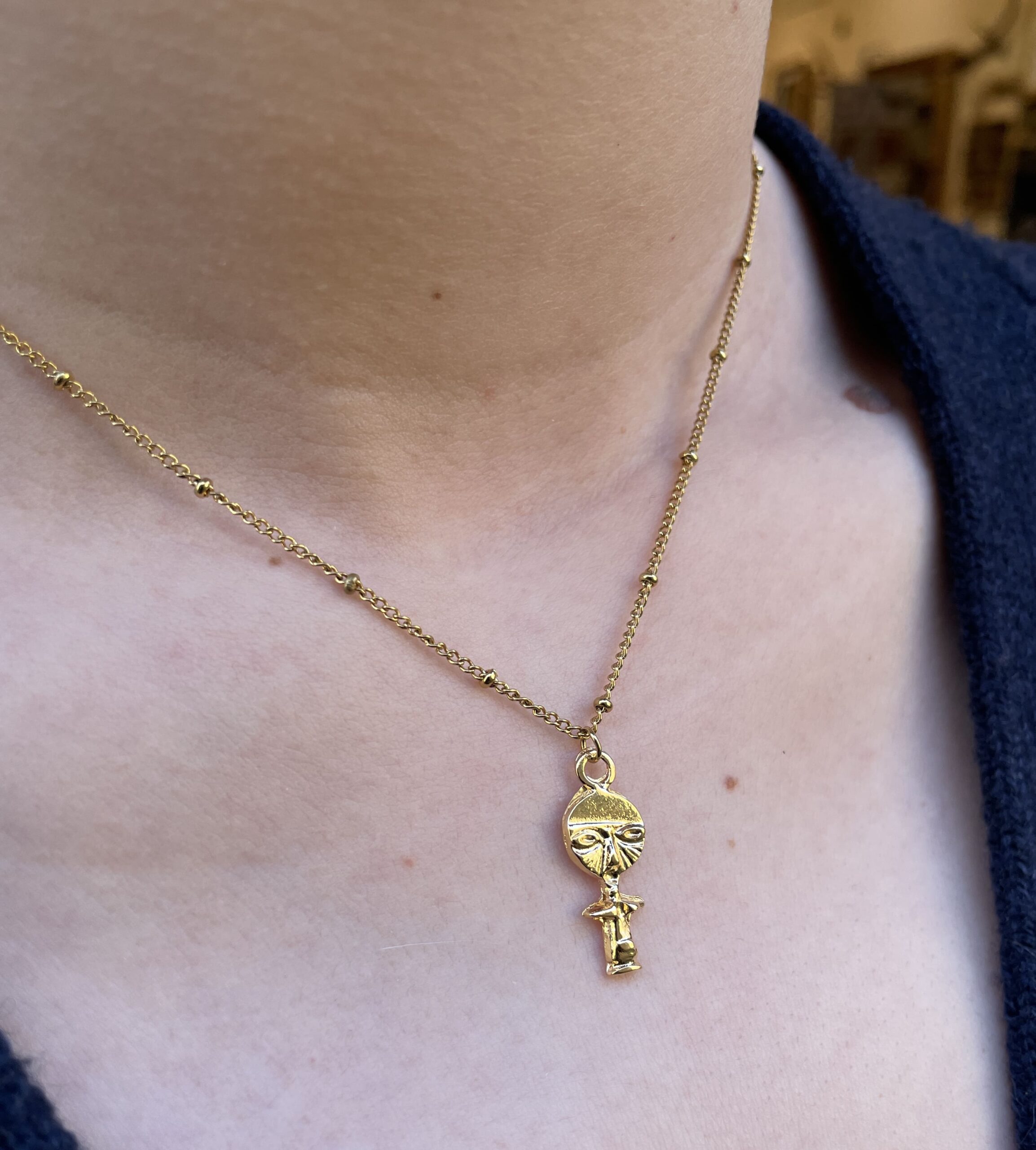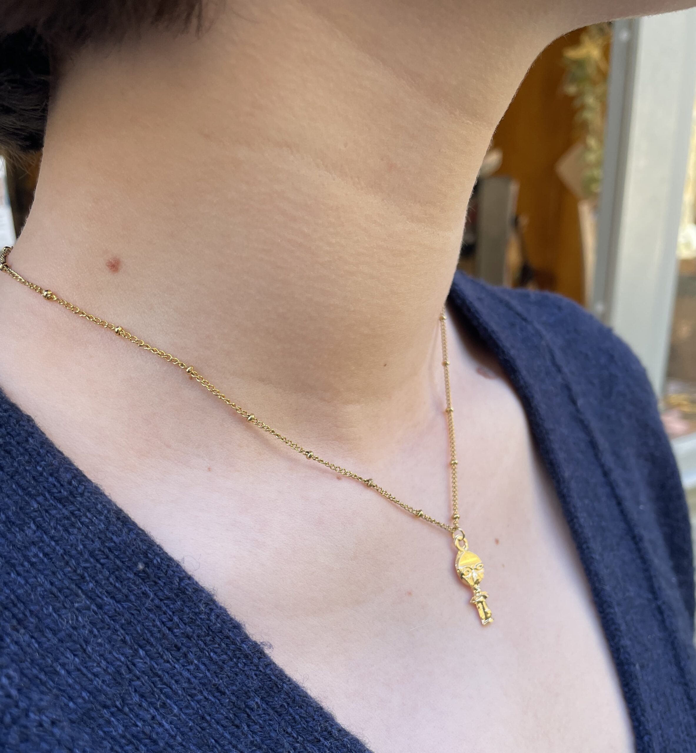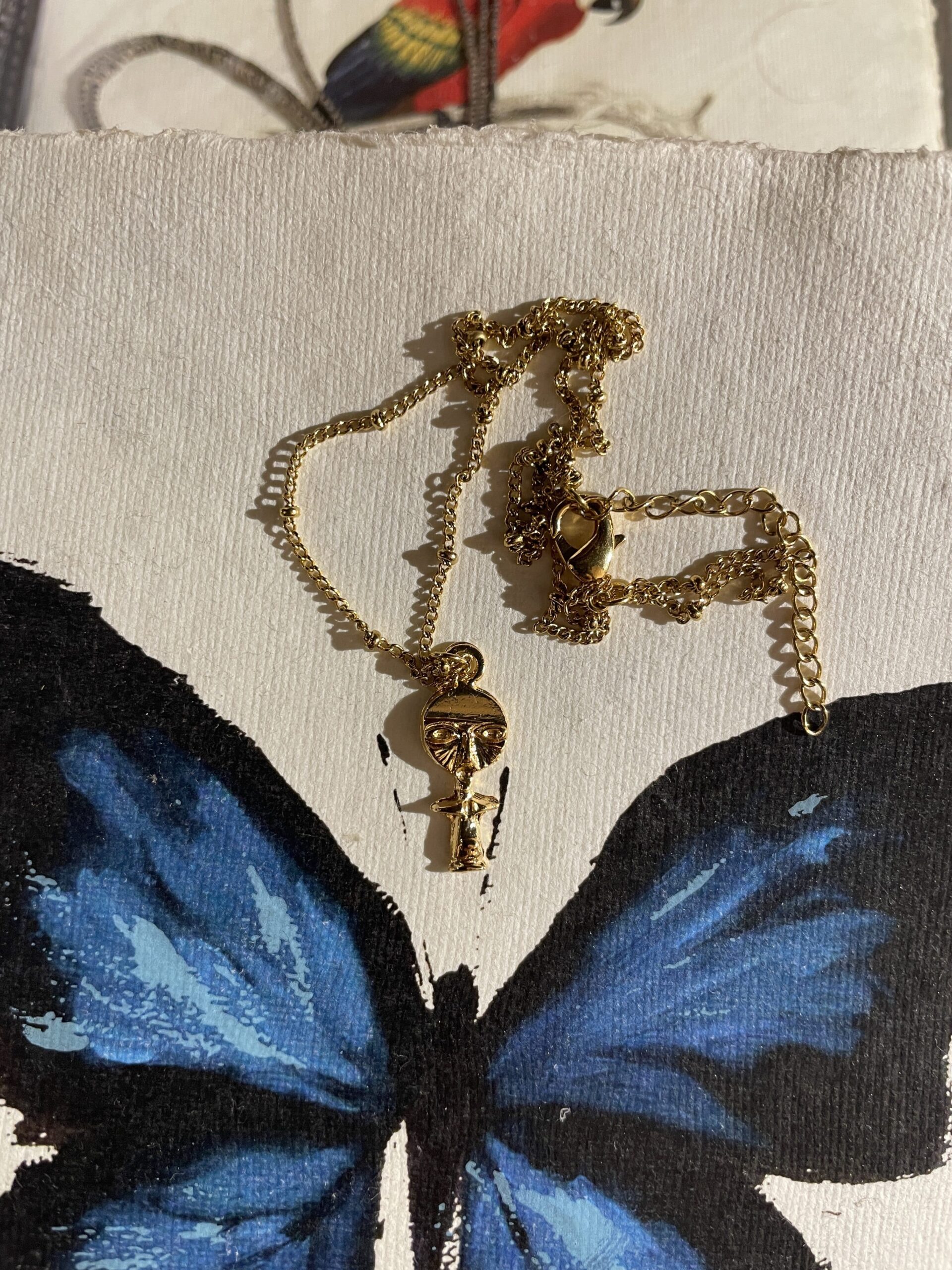 Collier avec le symbole de la poupée Ashanti en plaqué or. Chaîne acier inoxydable doré, fermoir avec chaîne de rallonge. Représente la fécondité et la maternité. Ghana Afrique
