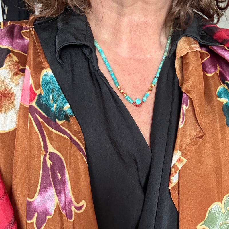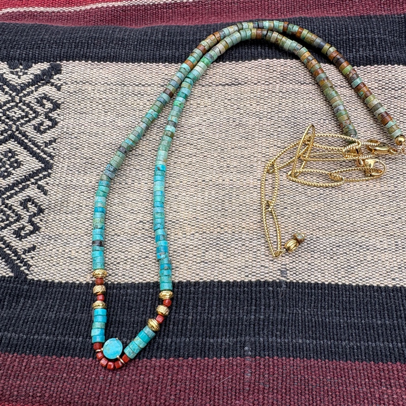 Collier en perles de turquoise naturelles et jaspe rouge, orné d’un petit médaillon central en turquoise. Longueur ajustable pour un porté court ou légèrement plus long, idéal pour une touche bohème et naturelle.
