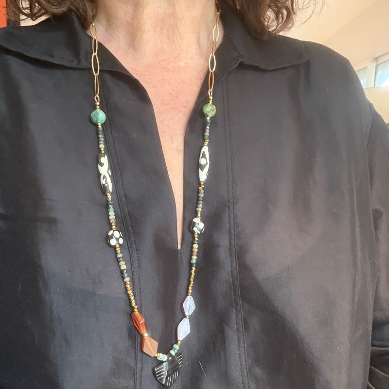 Un sautoir au caractère brut et bohème, pensé comme un souvenir de voyage, pour celles et ceux qui aiment les bijoux qui racontent une histoire.