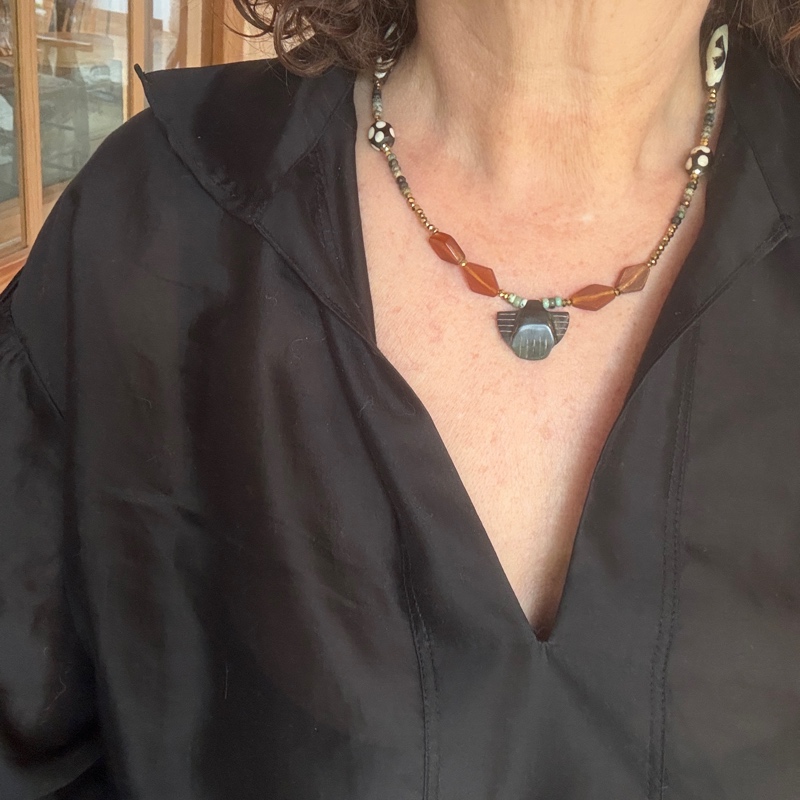 En pièce centrale, un aigle en corne. Autour, un collier mêlant hématite, turquoise, perle en os et perles de verres caramel translucide, comme un écho entre le ciel et la terre !