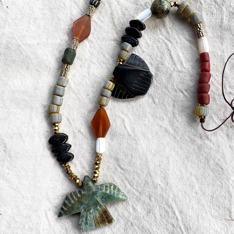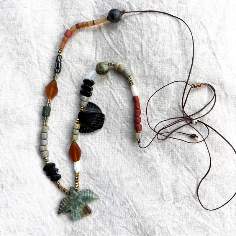 Sautoir avec représentation de deux rapaces, un en jaspe et l’autre en corne. Le sautoir est monté sur un fil de coton ciré chocolat, il est réglable par un noeud coulissant.