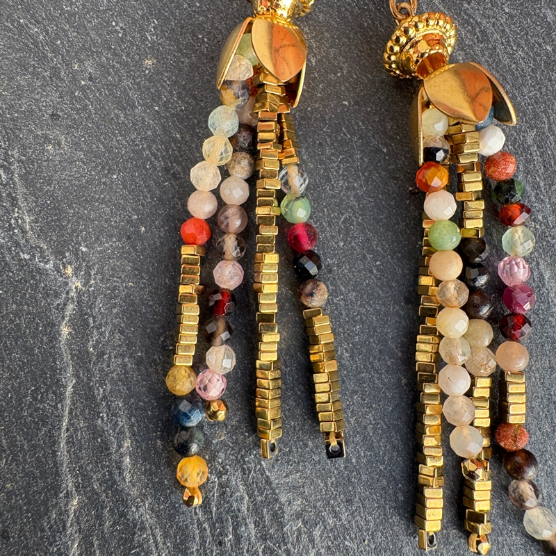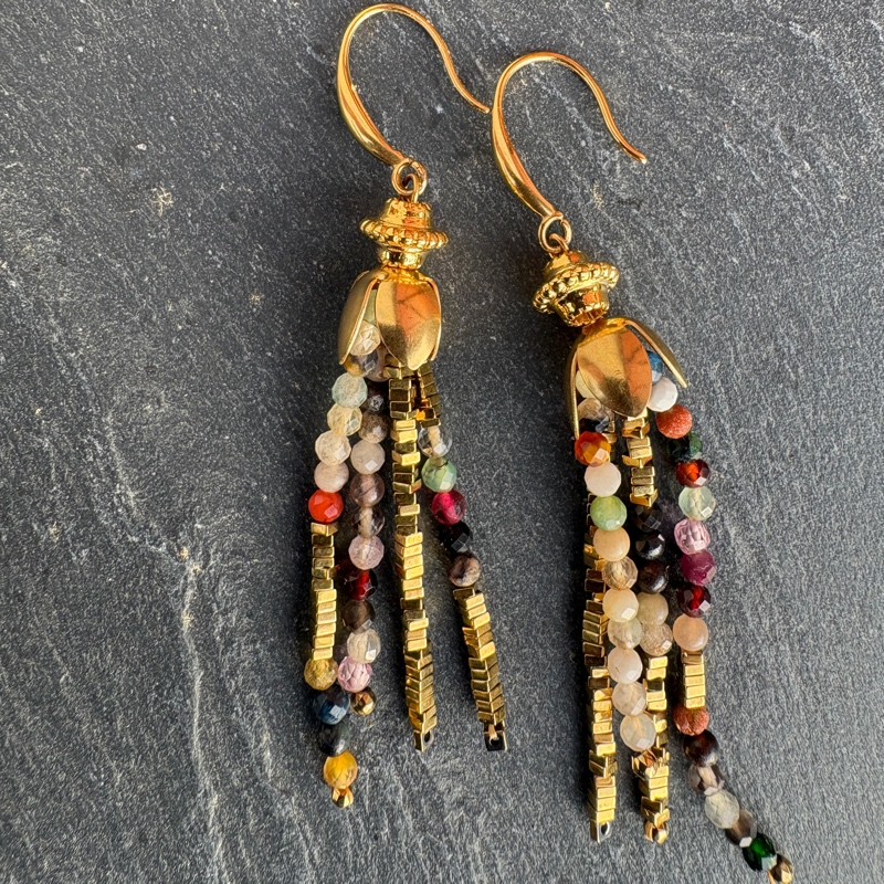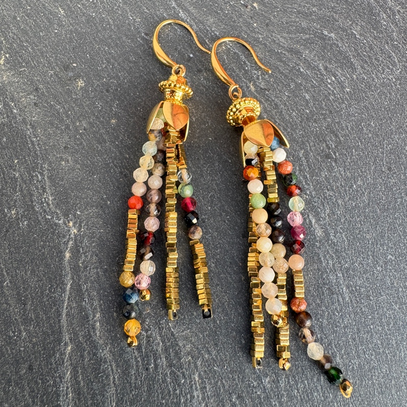 Les Boucles d’oreilles Pampilles en agates multicolores sont des boucles pétillantes. Elles sont composées de quatre fils de perles d’agates multicolores de 3 mm et d’hématites qui rehaussent les couleurs. Une calotte en forme de pétales de fleurs vient chapeauter le tout.