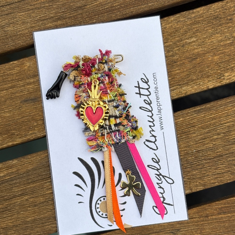 Chaque pièce est faite main avec soin, composée de tissus différents, de galon, de perles et de breloques symboliques choisies pour leurs vertus protectrices et porte-bonheur.