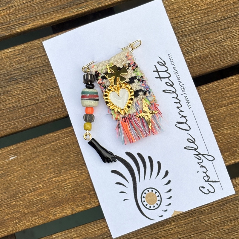 Chaque pièce est faite main avec soin, composée de tissus différents, de galon, de perles et de breloques symboliques choisies pour leurs vertus protectrices et porte-bonheur.