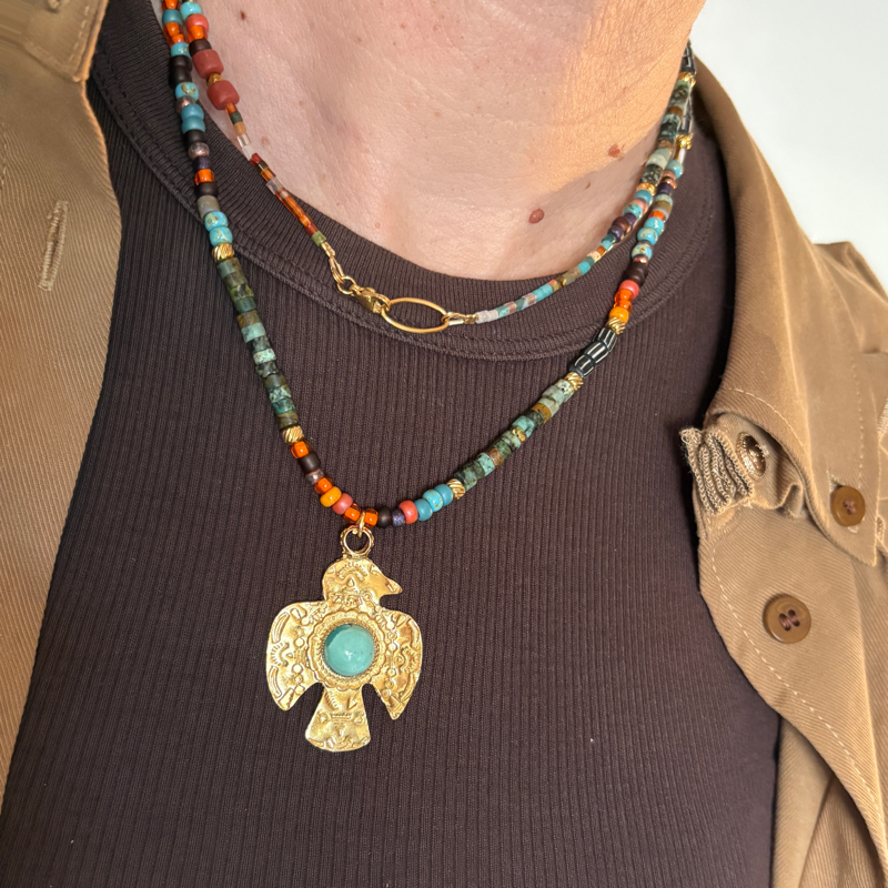 Ce sautoir artisanal est une invitation au voyage et à la spiritualité. Réalisé à la main avec soin, il associe la transparence lumineuse des perles de verre tchèque à la profondeur naturelle de la turquoise africaine.