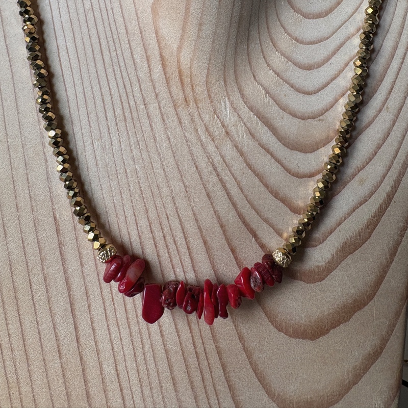 Sublimez votre style avec ce collier en hématite dorée brillante, rehaussé de délicates perles de corail bambou en forme de chips. L’éclat métallisé de l’hématite se marie harmonieusement à la profondeur du corail bambou , créant un bijou scintillant, moderne et élégant.