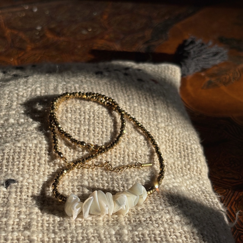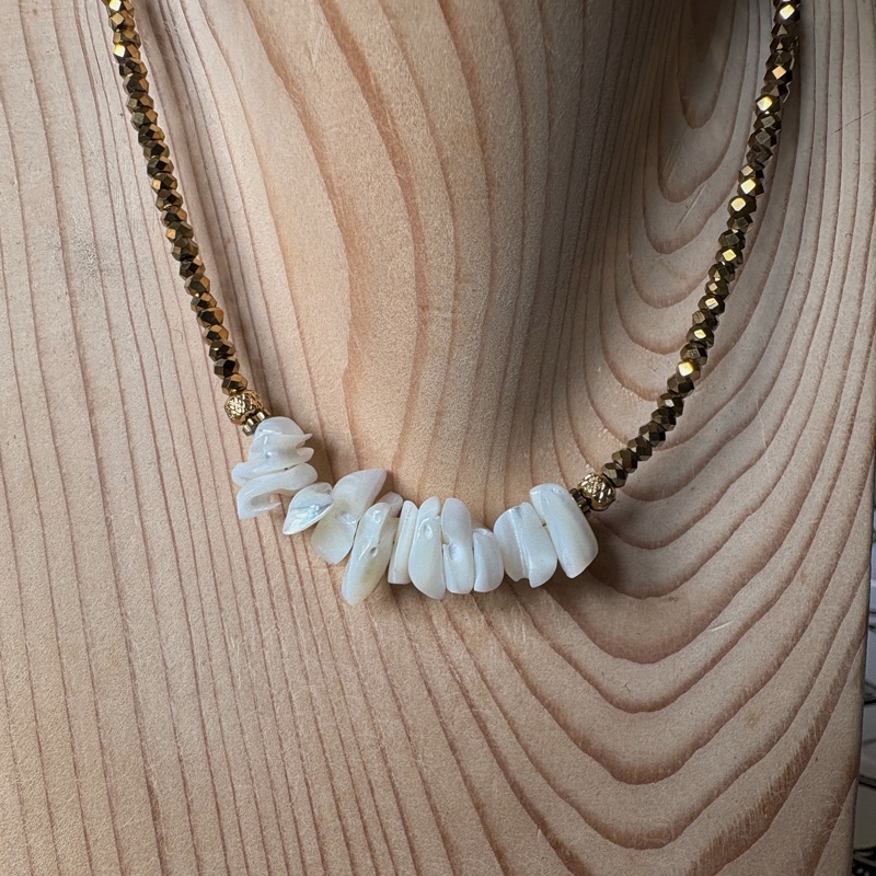 Sublimez votre style avec ce collier en hématite dorée brillante, rehaussé de délicates perles de nacre en forme de chips. L’éclat métallisé de l’hématite se marie harmonieusement à la douceur de la nacre créant un bijou scintillant, moderne et élégant.