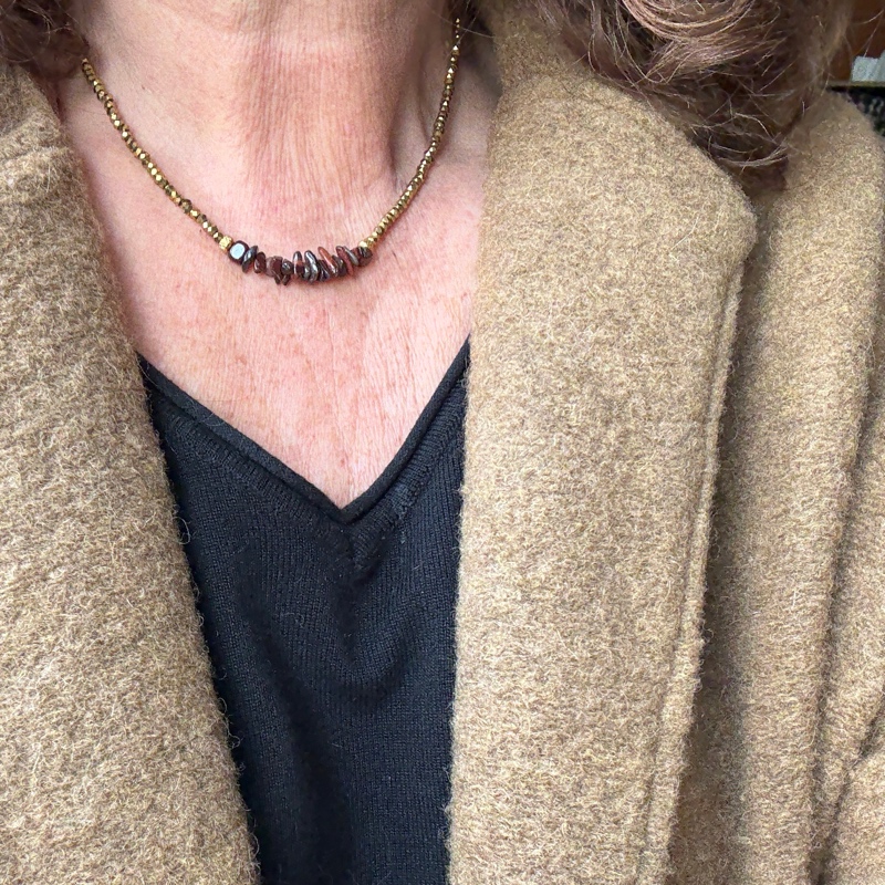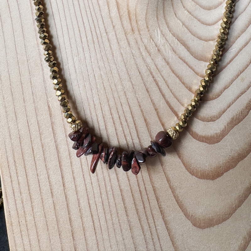 Sublimez votre style avec ce collier en hématite dorée brillante, rehaussé de délicates perles d’oeil de taureau en forme de chips. L’éclat métallisé de l’hématite se marie harmonieusement à la force de l’oeil de taureau créant un bijou scintillant, moderne et élégant.