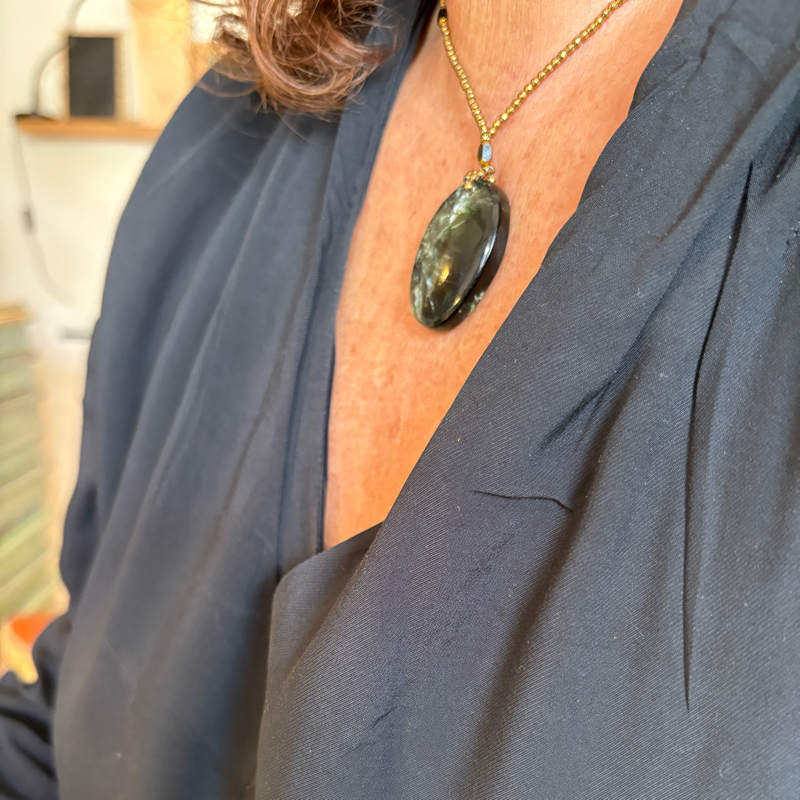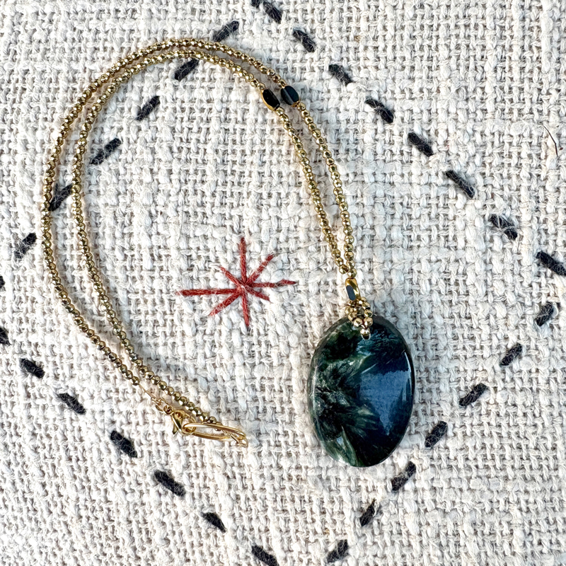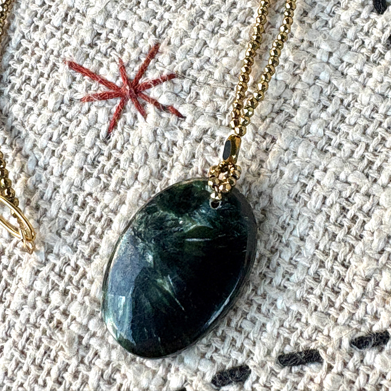 Perles d’hématite dorée, 3 perles de verre noires et une séraphinite (3,8 cm / 2,5 cm)