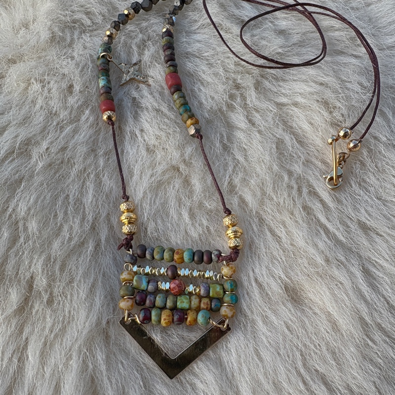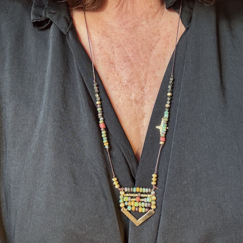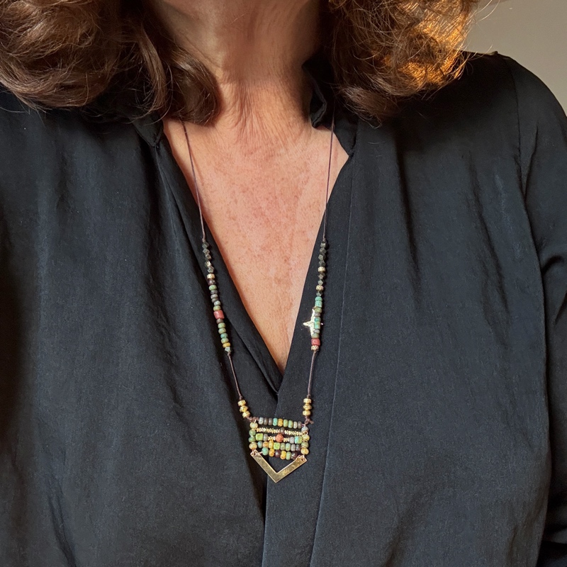 Montage ethnique sur fil de coton ciré chocolat, pièce triangulaire en acier inoxydable.