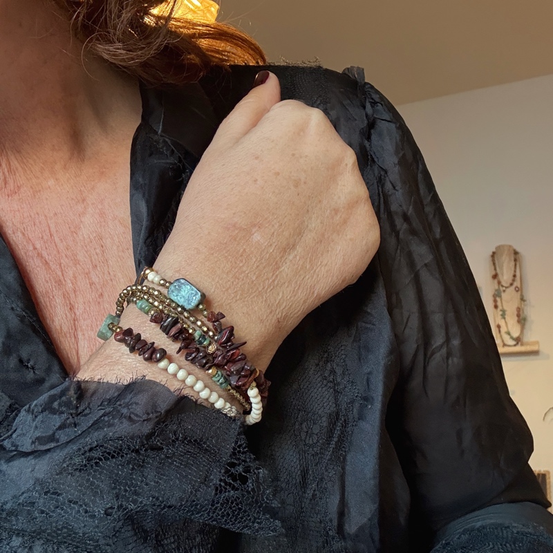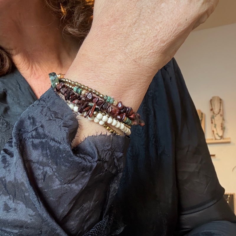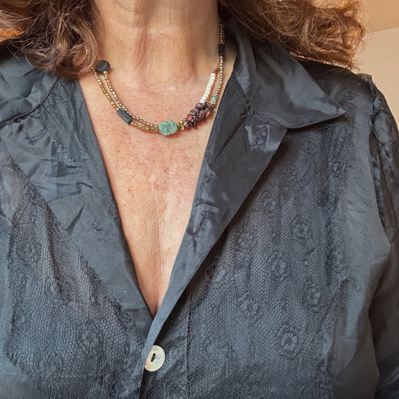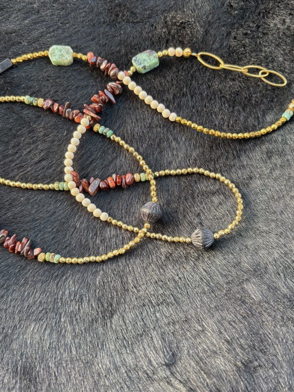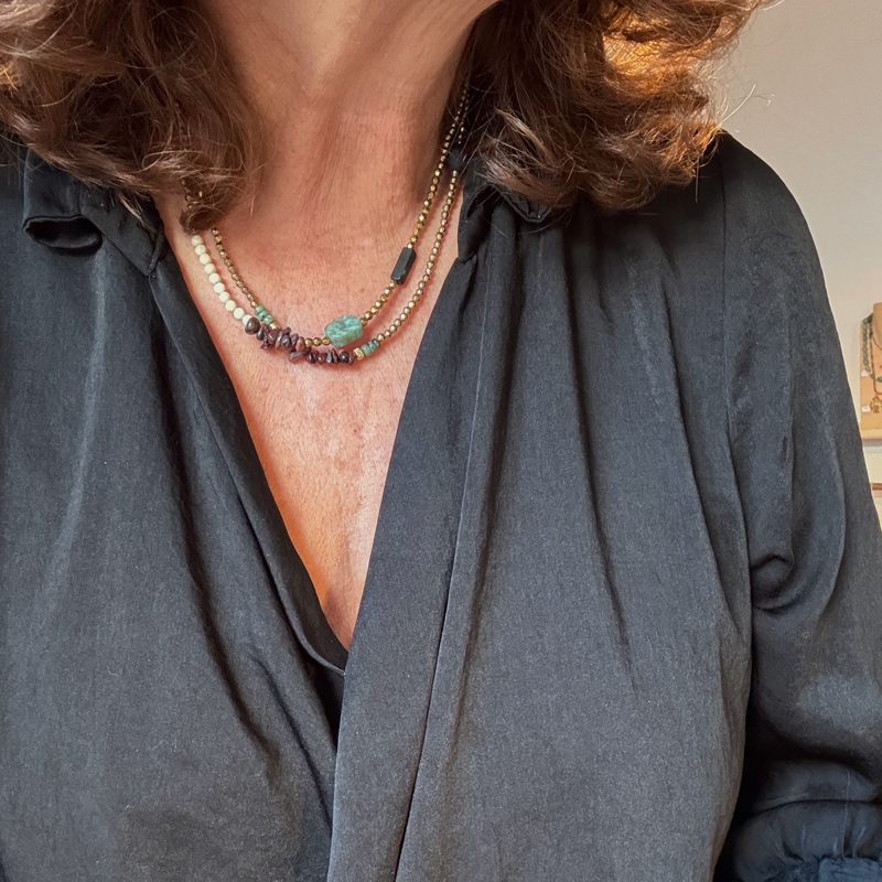 La turquoise africaine apporte une touche naturelle aux nuances vertes et mouchetées, l’onyx noir offre profondeur et sophistication, tandis que l’œil de taureau ajoute une chaleur intense aux reflets bruns. Les perles d’hématite dorée apportent luminosité et modernité, parfaitement équilibrées par l’éclat doux des perles de rivière blanches.