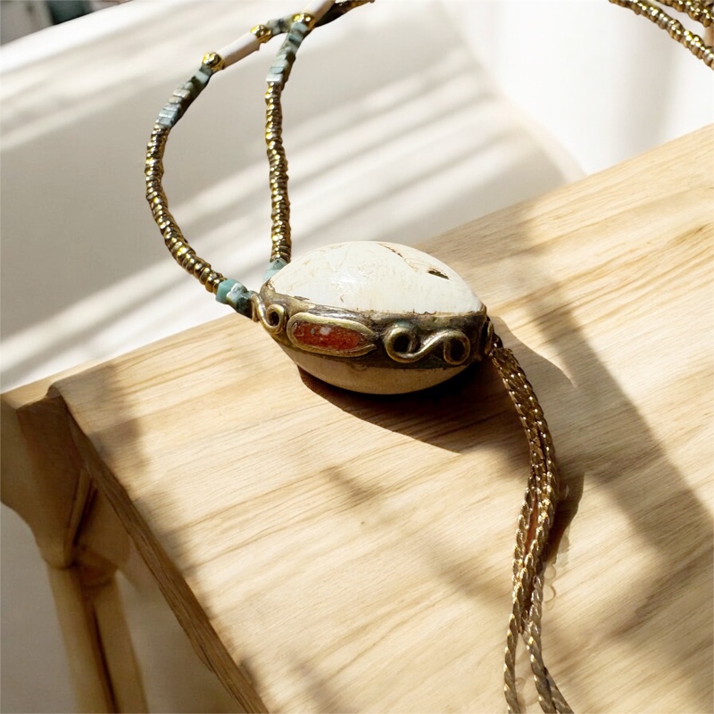 Sautoir – Pièce ancienne en coquillage & turquoise