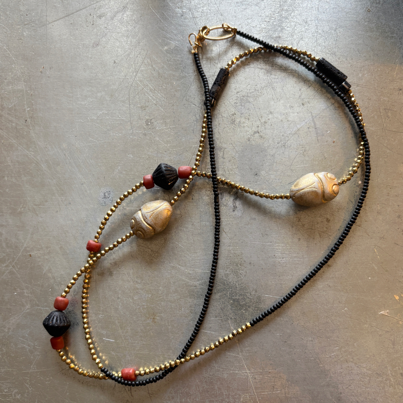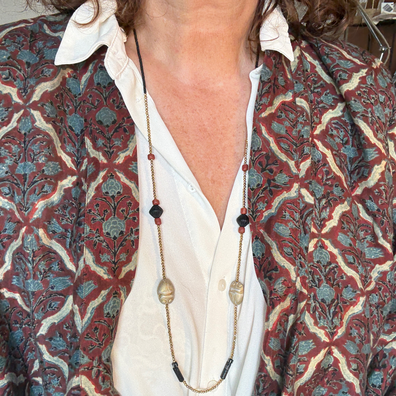 Deux scarabées travaillés symbolisent la renaissance, la protection et la force intérieure. Un sautoir à l’énergie solaire, à la fois moderne et intemporel, qui accompagne aussi bien les tenues du quotidien que les looks plus habillés. Il peut être porté en deux tours également.