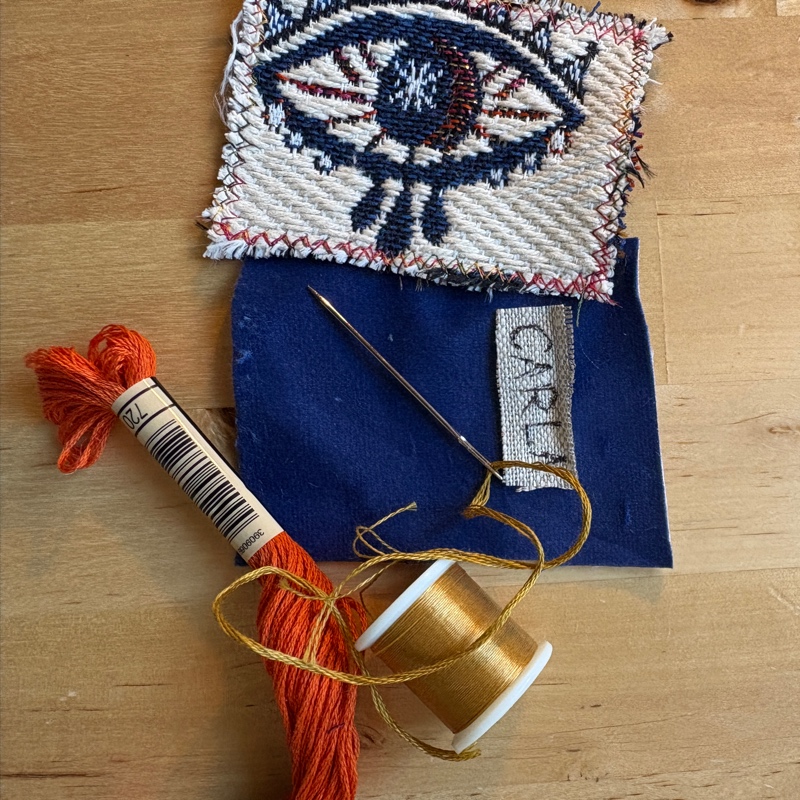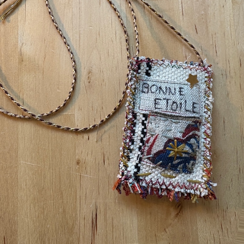 À partir de tissus, rubans et symboles, chacun fabrique une pochette unique où chaque point de couture devient une intention.