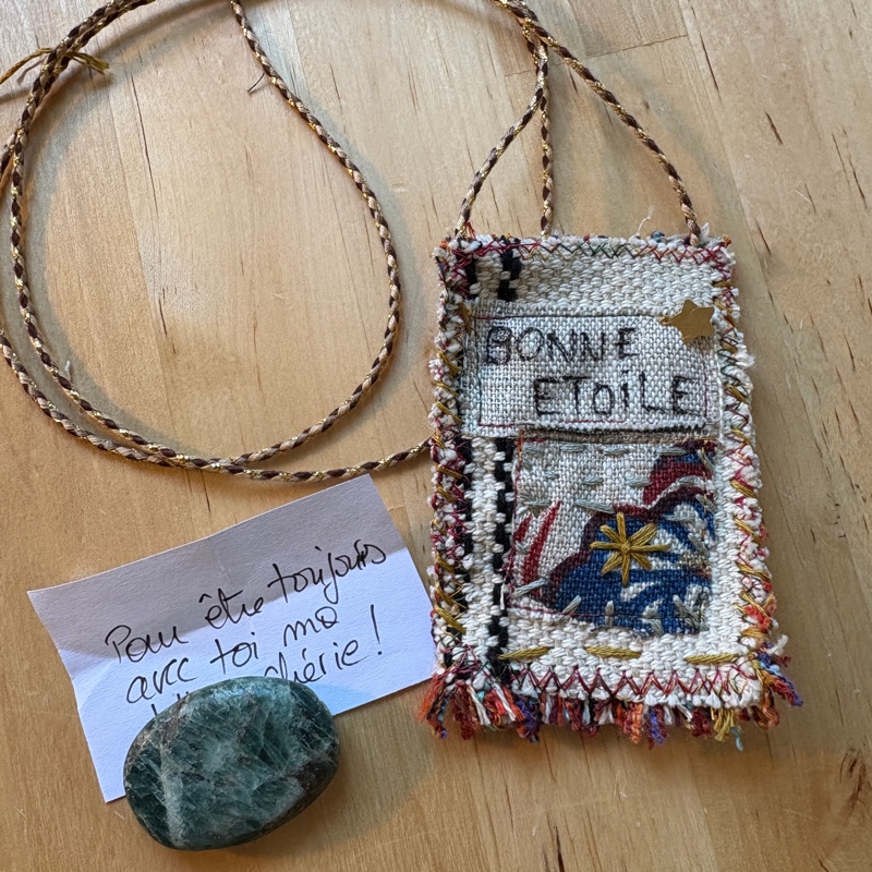 Une fois réalisée, la pochette peut accueillir un mot doux, une pierre, ou un petit trésor choisi pour accompagner la personne au quotidien.