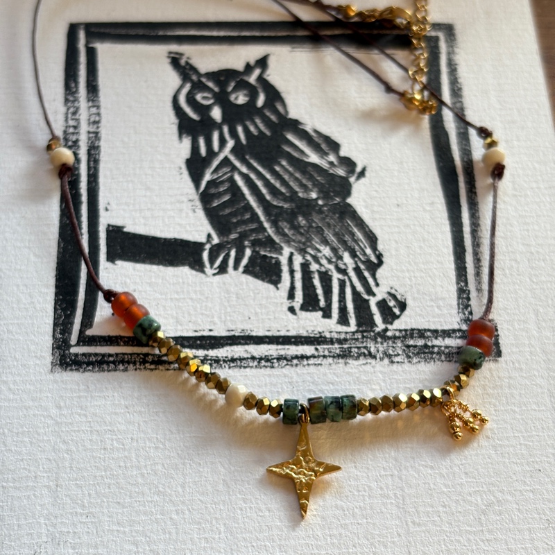 Perles de verre, hématites, perles de rivière facettées, turquoises africaines et pampilles dorées en acier, une en forme d’étoile et l’autre en petit pompon.