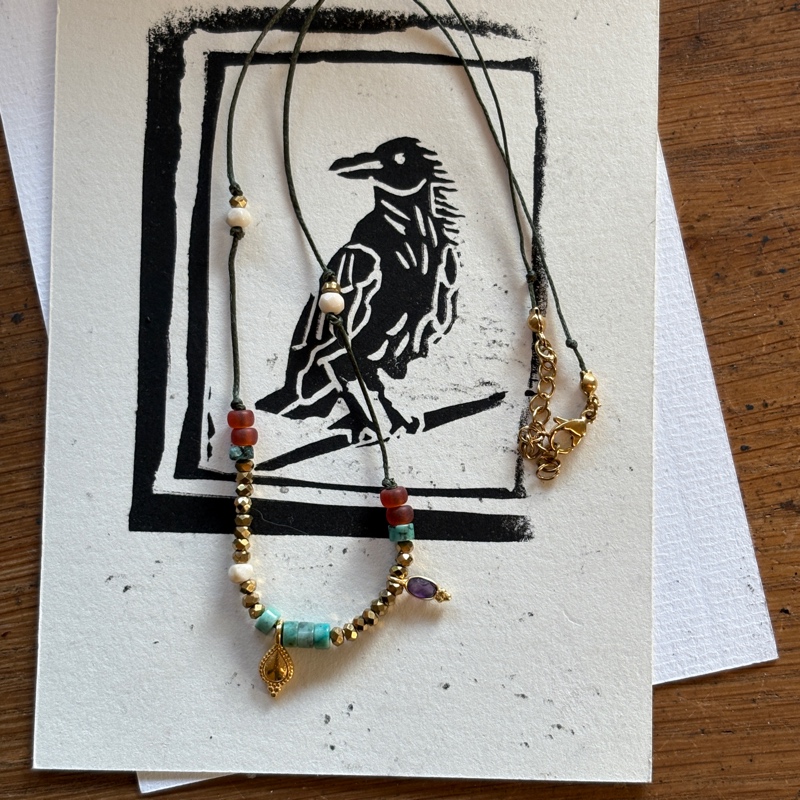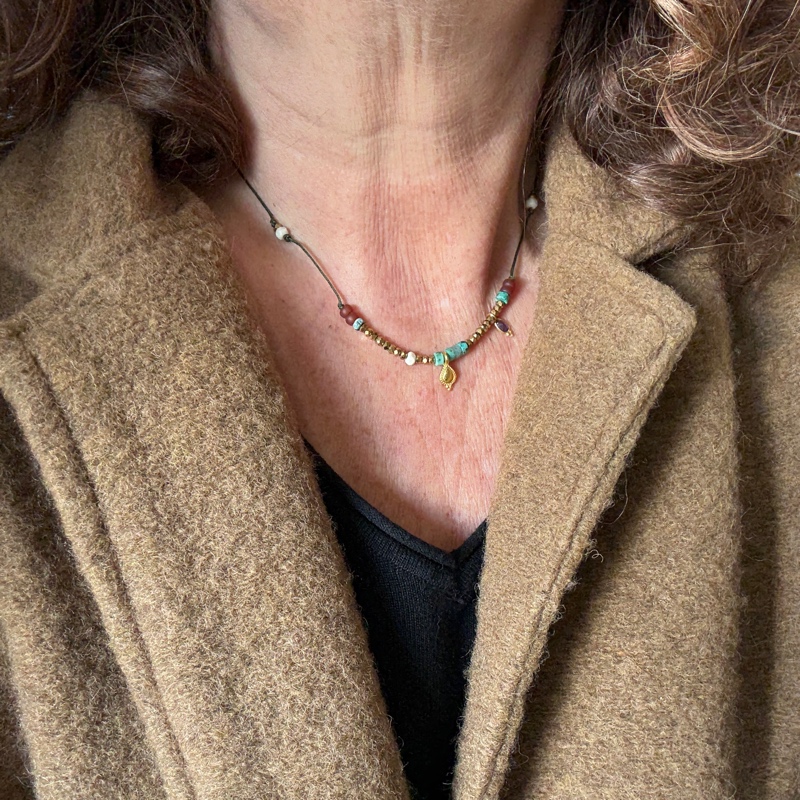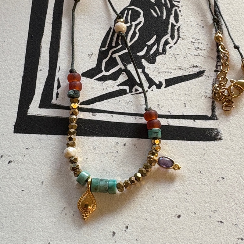 Perles de verre, hématites, perles de rivière facettées, turquoises africaines et pampilles dorées en acier, une en forme de goutte et une autre goutte en améthyste