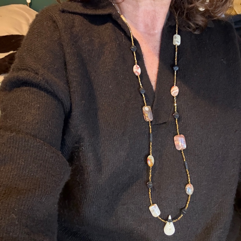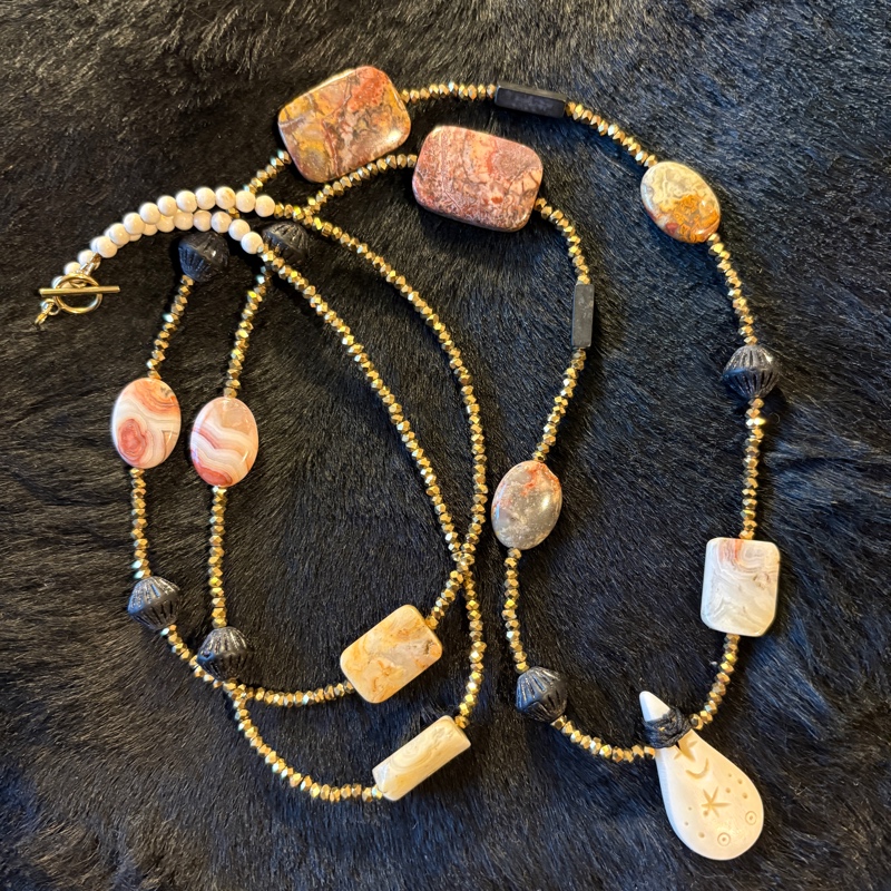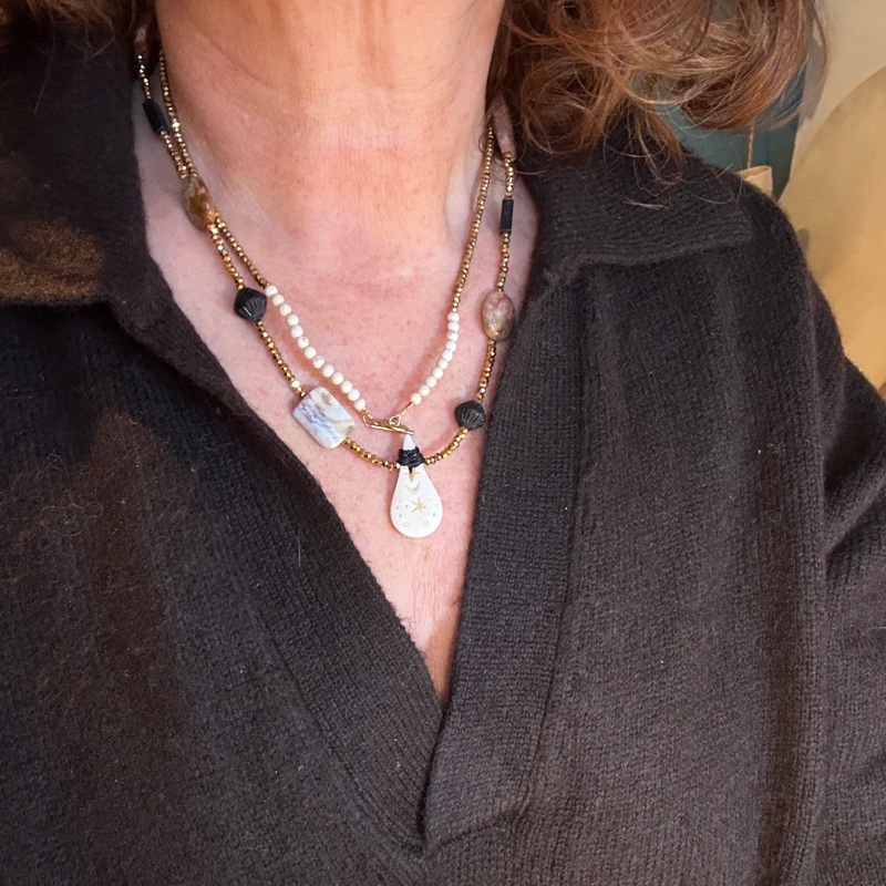Ce long sautoir associe avec élégance la profondeur minérale de l’hématite, l’intensité de l’onyx, la douceur vibratoire de l’agate, et l’éclat délicat des perles de rivière, ponctuées de perles noires en verre tchèque et d’un pendentif en corne avce une etoile et une lune gravées.